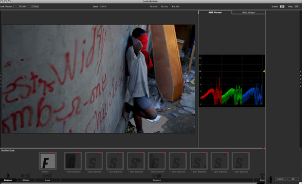 My first step in grading is almost always retouching a screenshot from the clip in Photoshop. I then use the Photoshopped still as a reference for my color grading. I started the grade in FCP using the three-way color corrector to shift the mids and shadows to a warmer color tone. From here on out I live in Magic Bullet Looks to fine-tune the exposure and colors. I rarely ever use the looks presets as they are overused and can get more precise results by building my own.