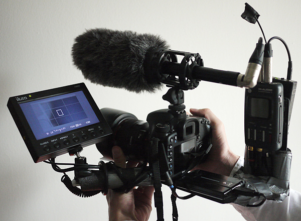In the end, I ended up saving money and getting a kit I could deal with. A $8 bracket (it’s literally the cheapest flash bracket that B&H stocks) holds the Ikan V5600 monitor out in front to the left of the lens just like the Sony Z1U. I splurged on another bracket (it was a hundred bucks), which holds the audio gear and balances the camera out by moving weight to the back of the camera.
