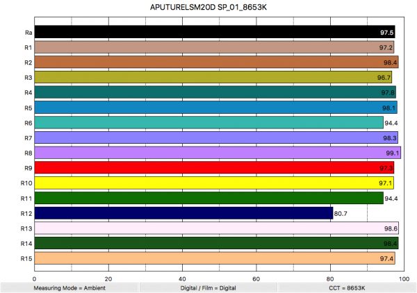 Above you can see that the LS-mini20 d in its full spot position recorded an average CRI (R1-R8) of 97.5 and an extended CRI (R1-R15) of 96.26. For replicating skin tones accurately the light recorded 97.3 for R9 (red), 98.6 for R13 (closest to caucasian skin tones), and 97.4 for R15 (closest to Asian skin tones). The numbers are all good and are in line with the manufacturers claims.