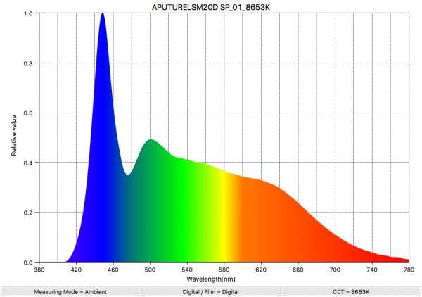 In what can only be described as a strange move on the part of Aputure, the LS-mini20 d has a kelvin colour temperature of 7500K (+/-300K). Off the top of my head, I can’t think of any other light that comes as a 7500K fixture. Calling it a daylight fixture as denoted by the “d” in its name is a bit of a stretch. In a market where 5600K fixtures are the norm, it’s hard to understand why this fixture bucks the trend.