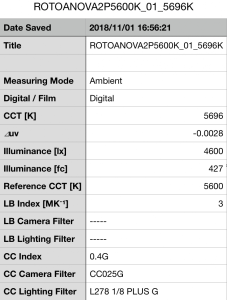 Above you can see the Rotolight Anova Pro 2’s spectral distribution when used at 5600K. The light has a push towards green as you can see.