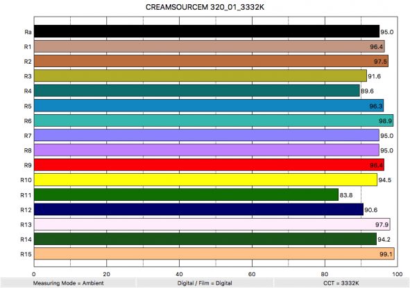 At 3200K the light recorded an average CRI (R1-R8) of 95.0 and an extended CRI (R1-R15) of 94.45. As far as replicating accurate skin tones the light recorded 96.4 for R9 (red), 97.9 for R13 (closest to caucasian skin tones), and 99.1 for R15 (closest to Asian skin tones). The score for R11 (green) was a little lower than I would have expected, but the overall results for proper skin tone reproduction were exceptionally good.