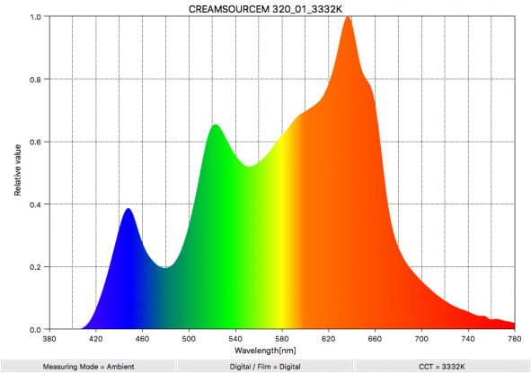 Above you can see the Creamsource Mini Colour’s spectral distribution when used at 3200K. While the light does have a nice full spectrum it certainly has both blue and green spikes.