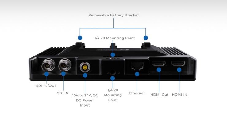 The Cine 7 has dual 3G SDI inputs as well as an HDMI input and loop out. Power is delivered via locking two-pin power connector (10-34V DC, 2A in) or battery bracket using Sony NP-F style batteries. There are also Gold Mount and V-Mount battery plates available separately.