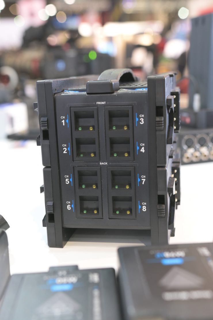 The Hawk Woods eight channel mini V-lok charger is designed to fit the company’s small V-mount batteries and to charge eight of them ‘semi-simultaneously.’