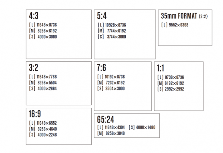 The GFX100 allows users to capture images in various formats and image qualities. This includes uncompressed/lossless compressed RAW and JPEG formats of varying image sizes, aspect ratios, and compression ratios. Its in camera RAW processing gives the option of saving 8bit or 10bit color depth images as 8bit or 16bit TIFF files. When using a 35mm format lens via a mount adapter, the camera can record images in a 36.0mmx24.0mm frame at the center (60.8M) as JPEG or TIFF (in camera RAW processing) formats.