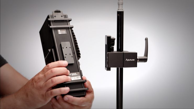 On both sides are where the V-Mount or Gold Mount batteries slide on. A nice upgrade is the option to use one battery but at the cost of half the output. Aputure recommends a 15 amp continuous discharge batterie with 12-16.8 volts.
