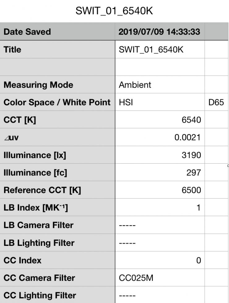 The CM-S75C gave me a reading of 3,190 lux and a Kelvin color temperature reading of 6540K. Just for reference, it had a CC score of 0. The reading of 3,190 lux exceeds SWITS claim of 3,000 lux.