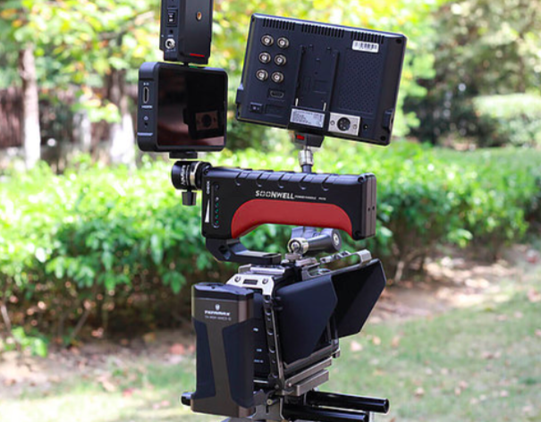 The battery has a 5-level LED charge readout that lights up to show remaining power status. This power handle can be charged via the SOONWELL 16.8v D-tap charger.