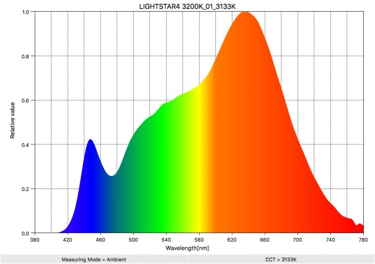 Above you can see the spectral distribution of the LUXED-4-LM when it is set at 3200K. The spectral distribution is very good for a LED light being used at 3200K.