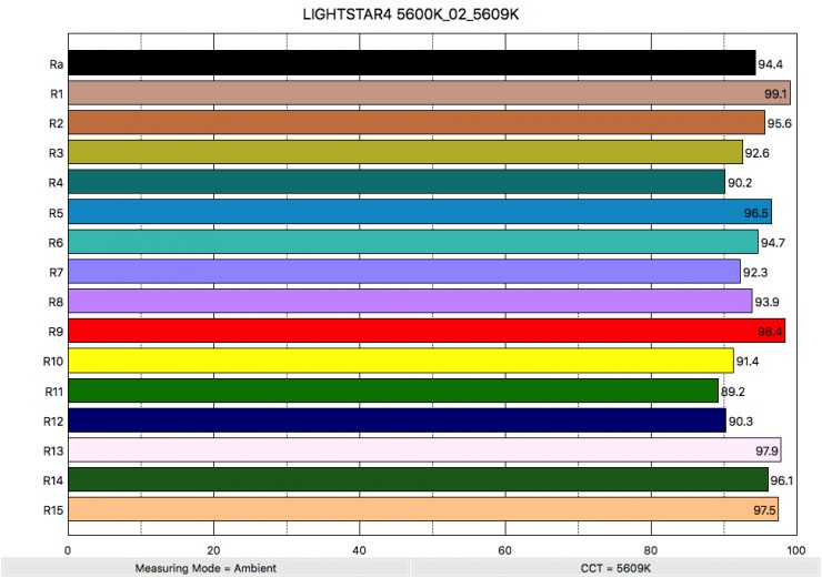 In this graph, the red bars indicate a perfect CIE D 5600K source. The Red bars indicate a perfect CIE D55 source. This lets us compare how close to a perfect 5600K lighting source the Lightstar is.