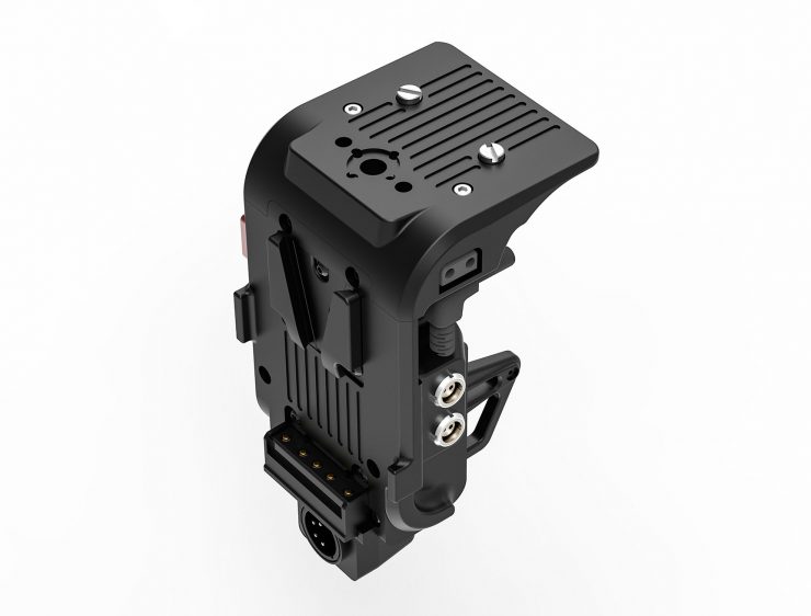 The Distribution box has a contoured design to match the shape of the camera and provides power distribution for a V-lock battery to power accessories with 2x D-Tap and 2x 2-pin LEMO ports.