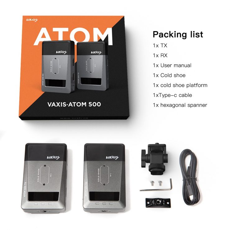 The Atom 500 comes with the TX unit, RX unit, user manual, 1x cold shoe, 1x cold shoe platform, a type C cable and a hexagonal spanner.
