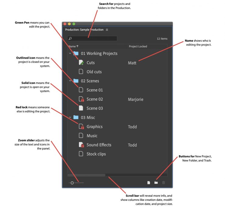 Any projects you add to the Productions folder become part of the production. Whether you are working on macOS or Windows, any changes you make on disk are reflected in Premiere Pro; changes in Premiere Pro are applied on disk. Productions keeps everything in sync.