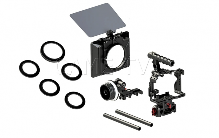 The package consists of a camera cage, top handle, riser plate with 15mm rod holes, 2x 20cm 15mm rods, a 15mm rod mounted follow focus, a matte box with a carbon fiber flag, and various sized lens clamping rings.