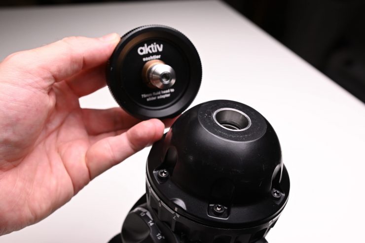 Because you don’t have to undo a traditional ball leveling clamp, you can remove the Aktiv 8 head from the Flowtech 75 really quickly. It utilizes a system that Sachtler is calling SpeedSwap.