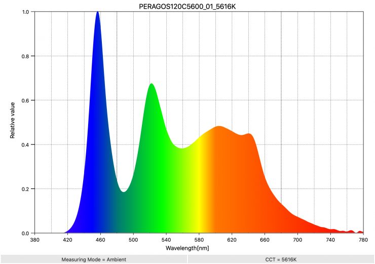 As a comparison, above you can see the spectral distribution of the Ledgo AltaTube 120C at 5600K.