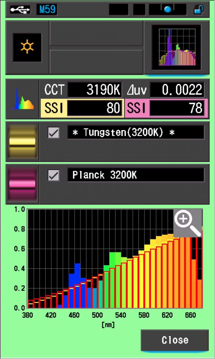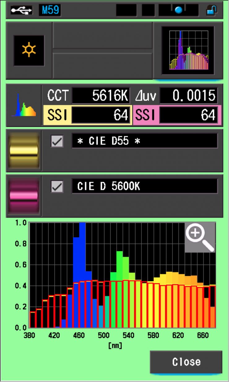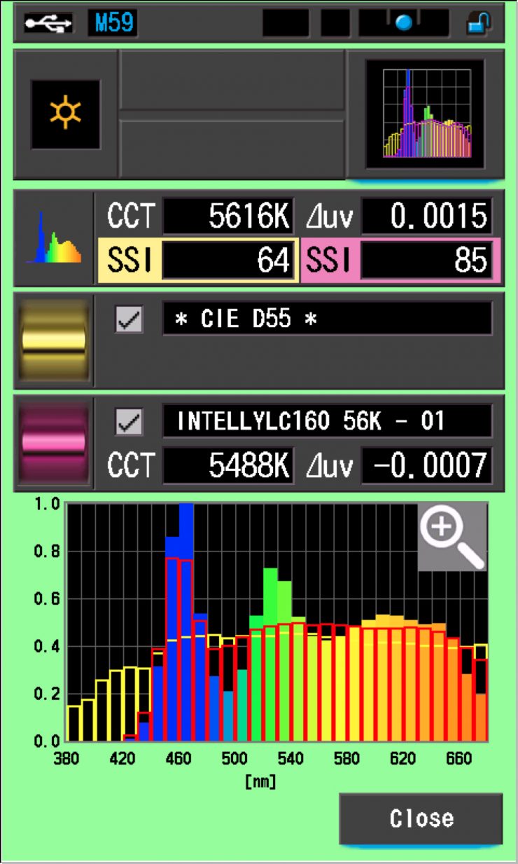 SSI (Spectral Similarity Index) was developed by the Sci-Tech Council of the Academy. SSI gives me the ability to set any light as a standard, or use predefined standards (such as CIE D55), and then give other lights an SSI score based upon how well they will match standards such as CIE D55 measure spectral response and compare it directly against an ideal light source.