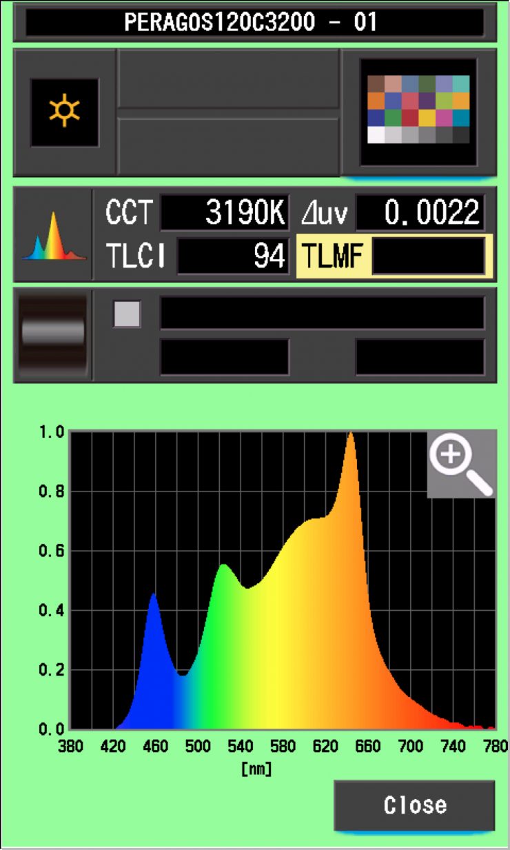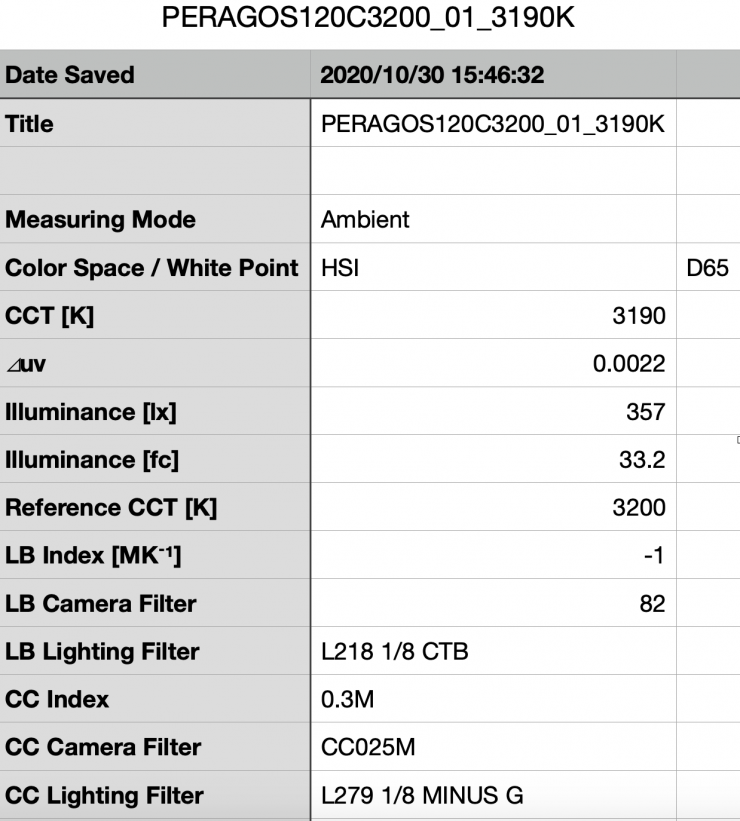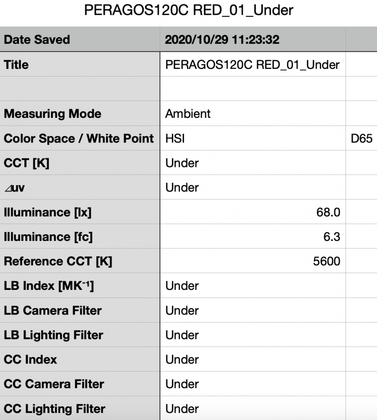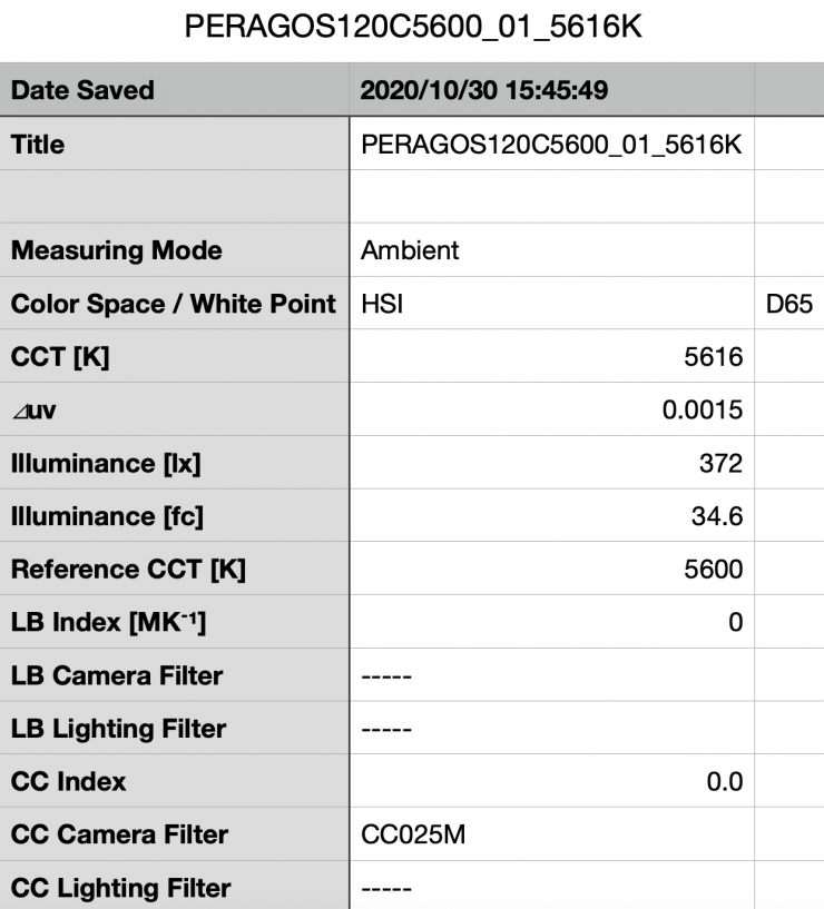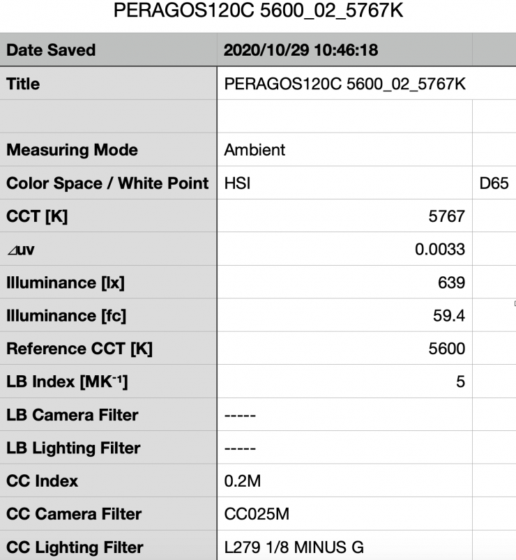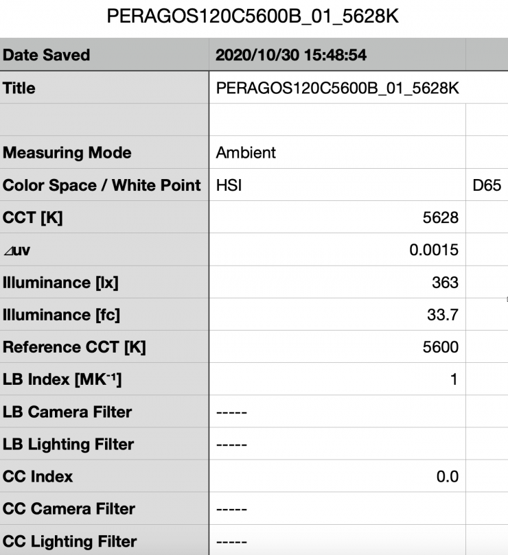 The CC Index displays the CC correction value and whether any magenta or green need to be added or subtracted. 1 CC corresponds to 035 Kodak CC values or 1/8 Rosco filter values. Any reading less than +1.00 or -1.00 and you’re probably not going to need to make any kind of adjustment. The ⊿uv is the value to show how much this light is away from being an ideal light source (black body radiation = incandescent lamp). As with the CC Index you want this number to theoretically be zero. Kelvin is not a linear value, so we need to convert from Kelvin to MK-1 to compare the values of color temperature. To calculate from Kelvin to Mired is MK-1= 1*1000000/Kelvin. While this may sound confusing, it is the only way of measuring if the Kelvin shift is significant enough to warrant having to use a filter for correction. Below are the results for the Peragos 120C PIXEL: