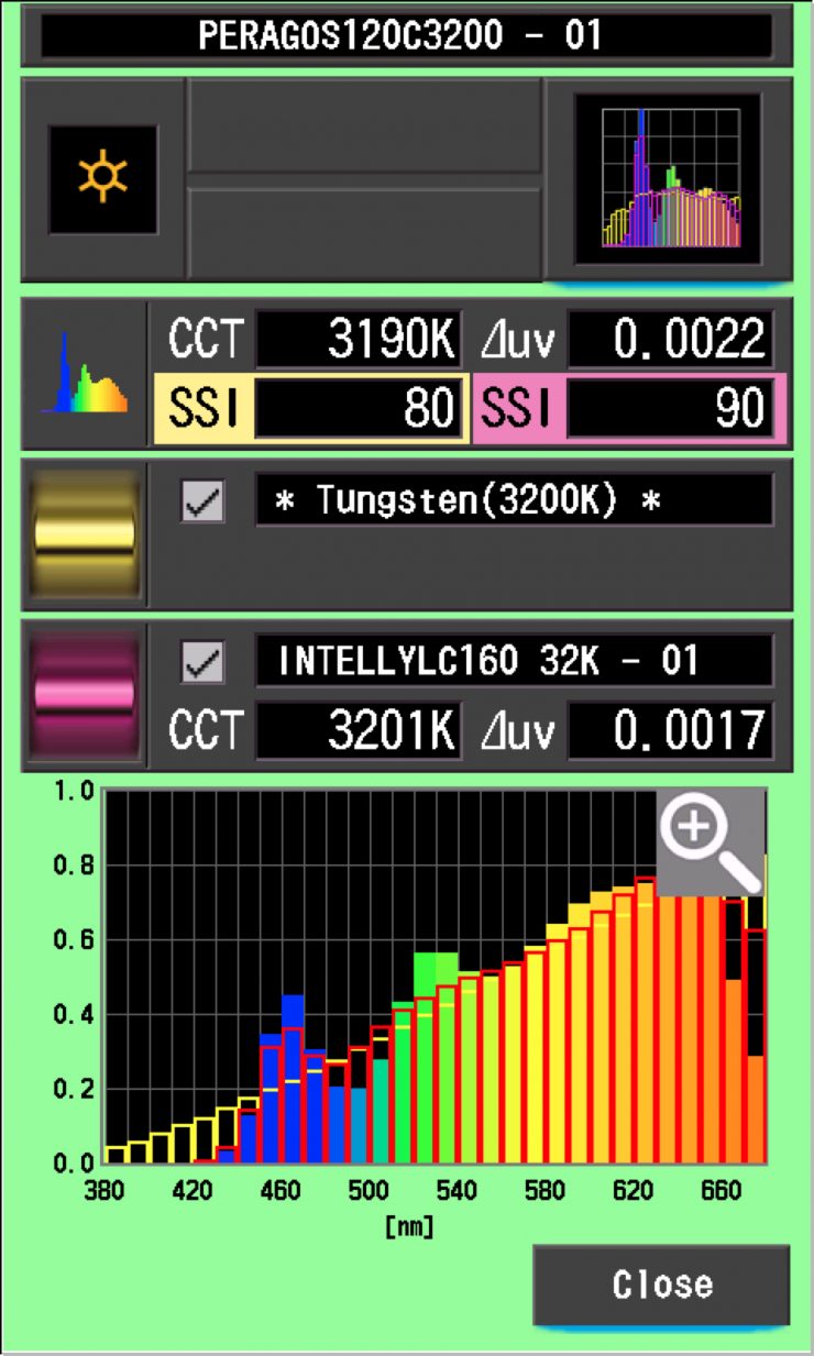The main reason we want to record SSI scores is so we can see how well they match with other lights. I was curious to see how well the Peragos 120C Pixel matched an Intellytech Litecloth C160 at 3200K and 5600K. Why would I want to do this? Well, if for example I wanted to use the Intellytech as my main key source and I wanted to use the Peragos as a backlight/hair light I want to know how well they will match.