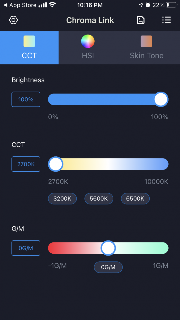 This is the mode most people are going to use the light in. In the CCT Mode, you have full access to making Kelvin color temperature adjustments between 2000-20,000K.