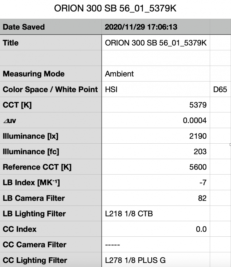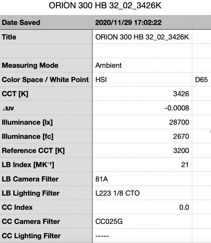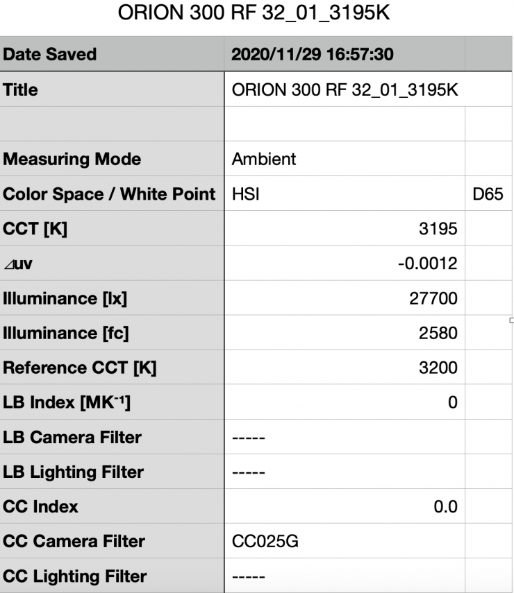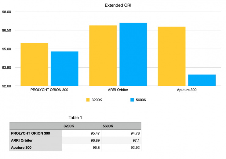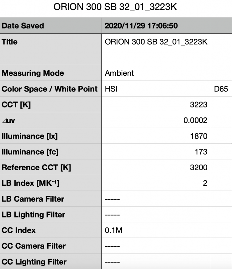 As another test, I thought I would compare those same lights against the Orion 300 at 3200K. Below you can see the results.