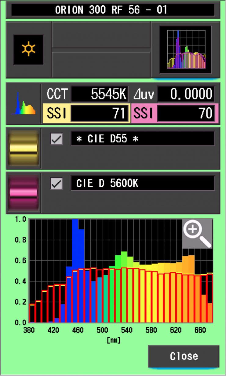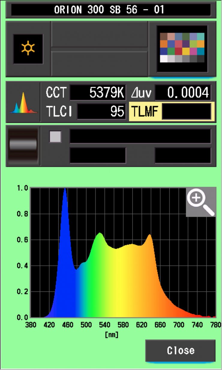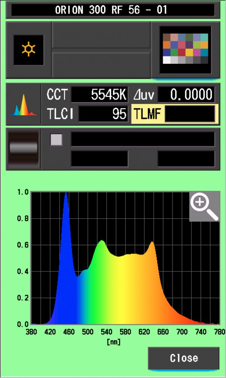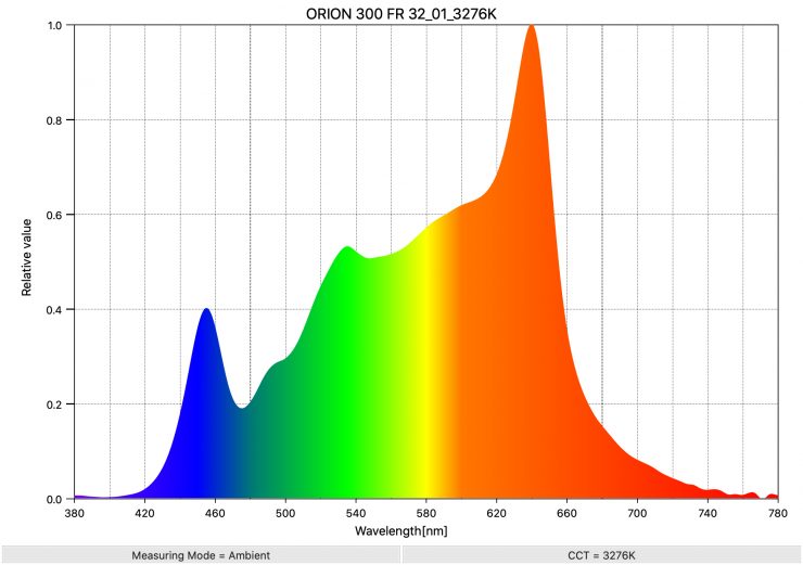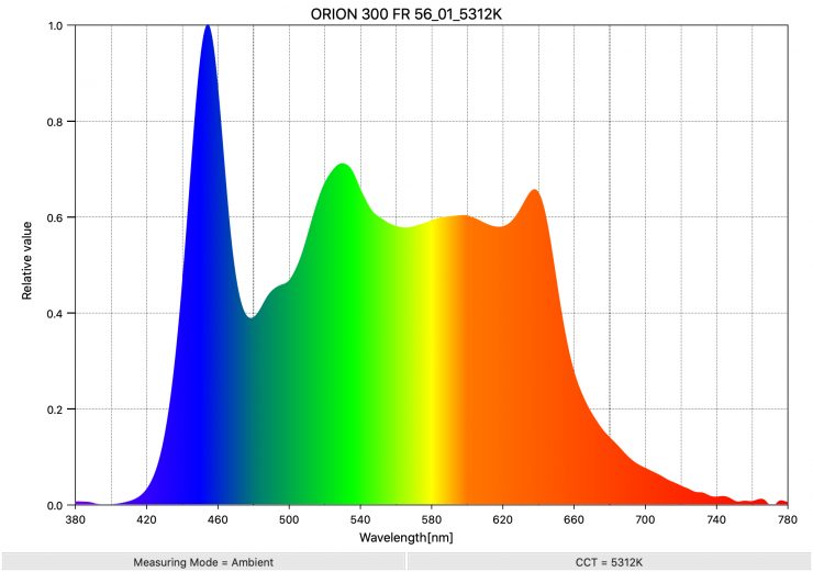 Above you can see the spectral distribution of the Orion 300 when it is set at 5600K. The spectral distribution is very full, but you can see a few spikes.