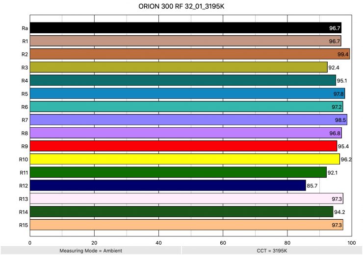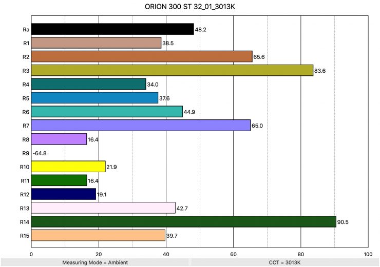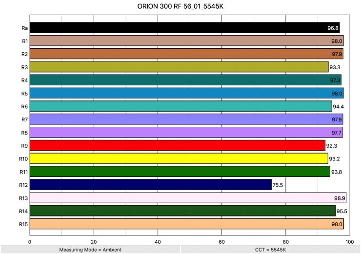 In the graph above the gold bars indicate a perfect CIE D55 source. The red bars indicate a perfect CIE D 5600K source. This lets us compare how close to a perfect 5600K lighting source the Orion 300 is. A score in the low 70’s is typical for a 5600K LED source.