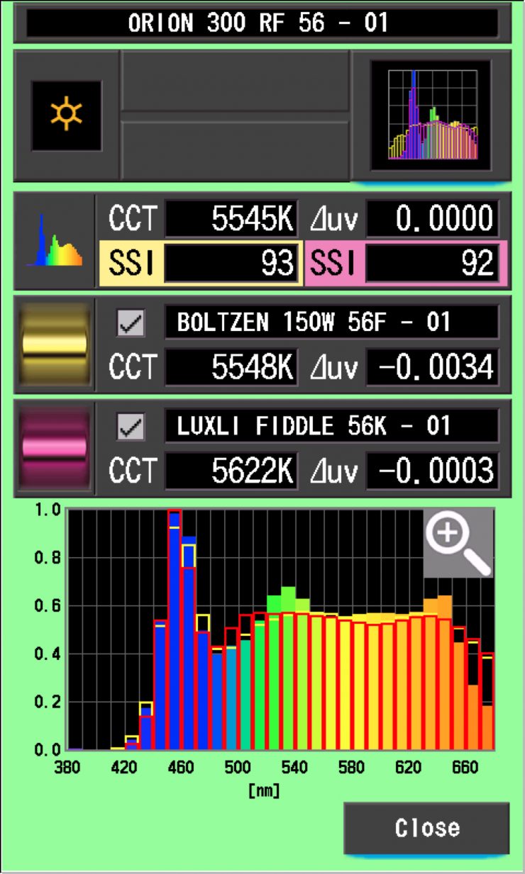 The main reason we want to record SSI scores is so we can see how well they match with other lights. As an example, I wanted to see how well the Orion 300 matched the CAME-TV Boltzen 150W and the Luxli Fiddle. Below you can see the results.