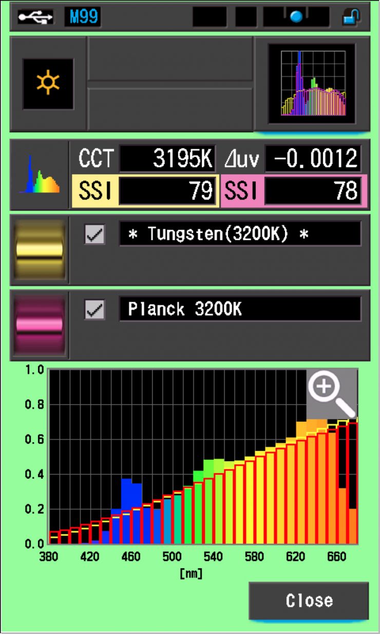SSI (Spectral Similarity Index) was developed by the Sci-Tech Council of the Academy. SSI gives me the ability to set any light as a standard, or use predefined standards (such as CIE D55), and then give other lights an SSI score based upon how well they will match standards such as CIE D55. This way I can measure spectral response and compare it directly against an ideal light source. This is actually a much better test than recording CRI scores.