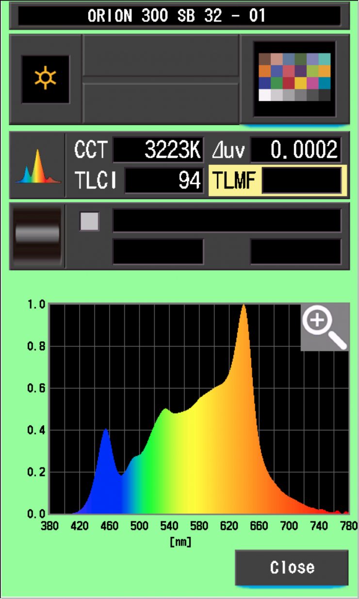 Above you can see the spectral distribution of the Orion 300 when it is set at 3200K. The spectral distribution certainly has a slight push towards green and it’s also missing some color information in parts of the spectrum. Although, with +/- Green adjustment you could easily correct this.