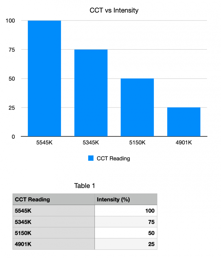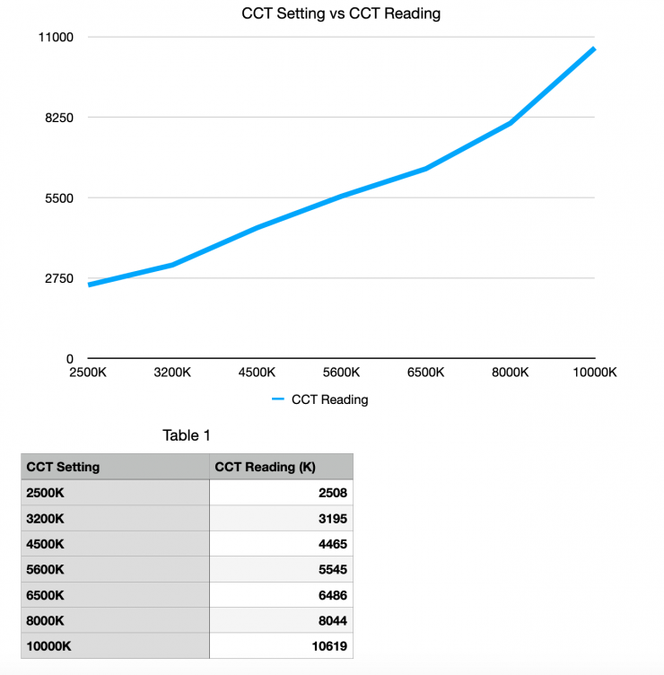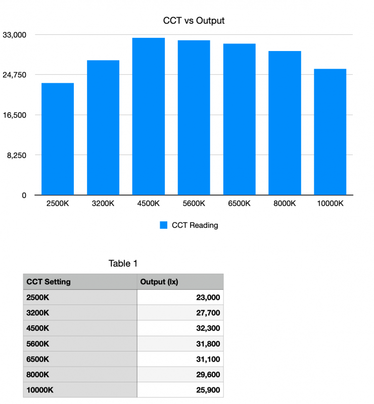 These figures might look confusing, but what it tells me is that the light is very Kelvin color accurate at all temperatures. Any MK-1 score that is under -9/9 means you wouldn’t have to use any color correction gels. The MK-1 scores for this light were extremely good.