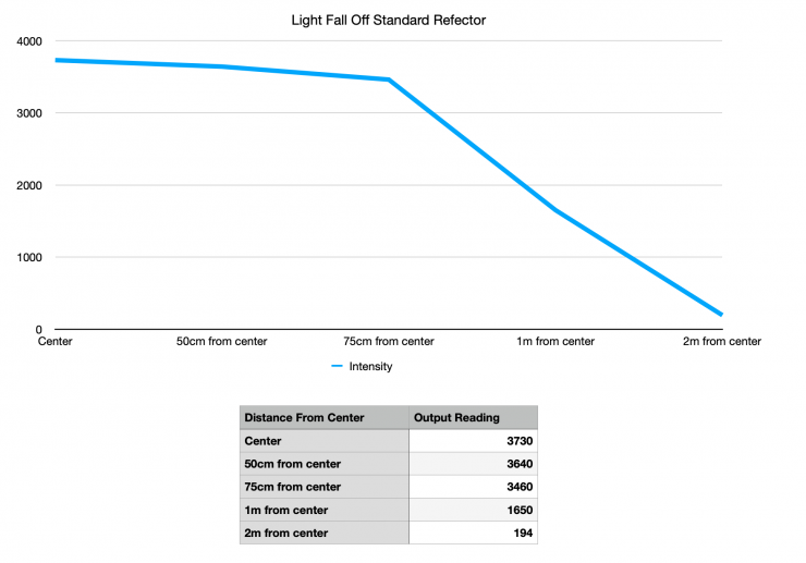 So how linear is the fall off from the Orion 300 when using the standard reflector? Above you can see. I tested the light at a distance of 3m to see how linear the fall off was once you started moving away from the center of the beam spread. The light has a nice linear fall off when using the standard reflector.