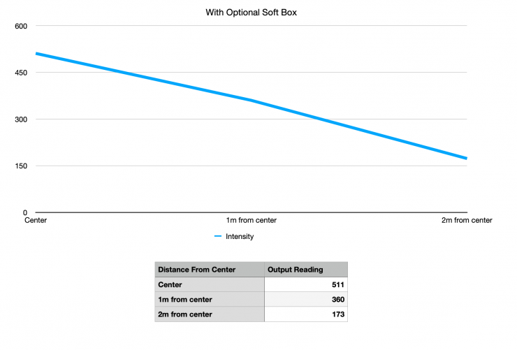 So how linear is the fall off from the Orion 300 when using the optional soft box? Above you can see. I tested the light at a distance of 3m to see how linear the fall off was once you started moving away from the center of the beam spread. The light has a nice linear fall off when using the soft box.