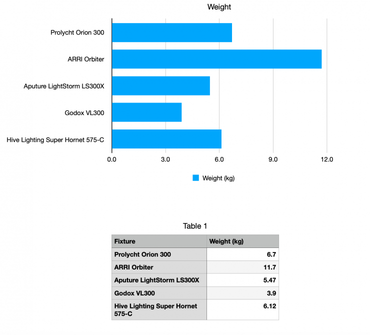 Just to be crystal clear, some of these lights don’t have the features of the PROLYCHT Orion 300. I am simply giving you a reference as to how it compares weight wise to other similar styled fixtures.