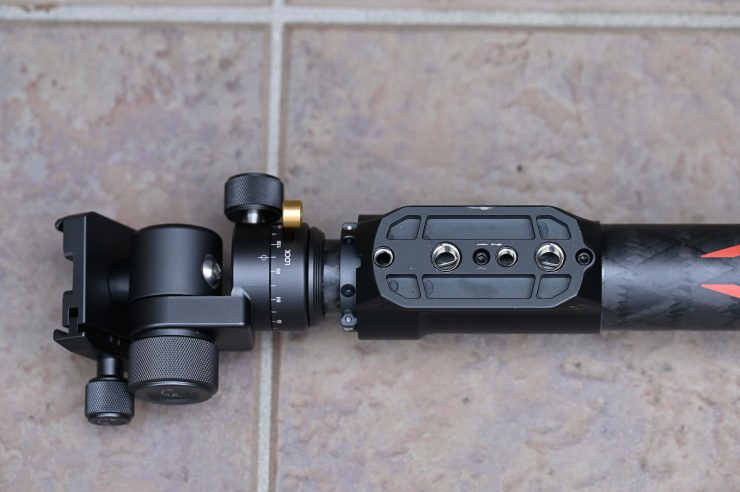 That mounting plate then slides onto the plate that is on the Slypod Pro’s pan & tilt head. You can also use a small-sized Arca Swiss quick release plates if you have one.