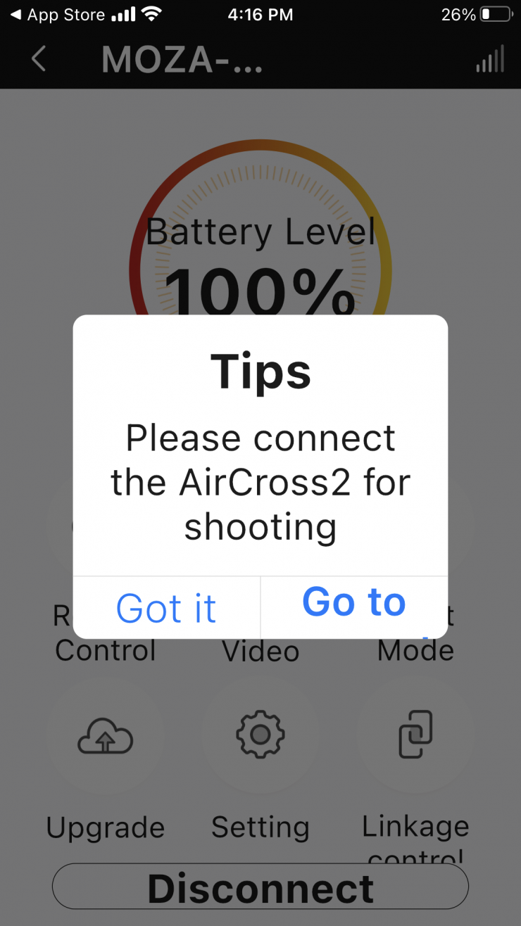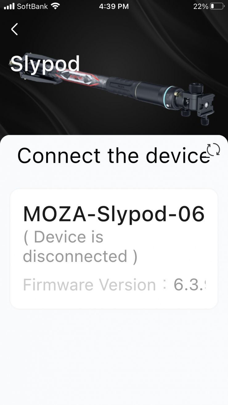 The app is pretty straightforward and easy to use. Once you turn on the Slypod Pro and launch the MOZA Master App you will see the device and you just hit connect. You are then greeted by the main menu.