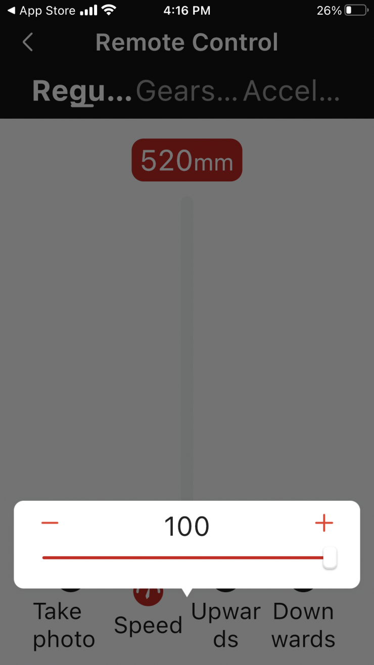 If you have the Silent Mode turned off, the Slypod Pro is really noisy if you just drag the sliders in the Remote Control mode. Dragging the sliders doesn’t seem to do anything even if you change the Speed. Even if you have the Speed set at 1 or 100 and you drag the sliders it still moves at the same speed. If you change the Speed I found that you had to physically press the Upwards or Downwards button for this to do anything.
