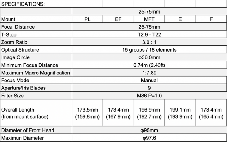 It’s available in PL, E-mount, MFT mount, and Nikon F mount options. Tokina also offers a 1.6x Expander in PL-to-PL or PL-to-E-mount that allows the lens to cover Vistavision-sized sensors, giving it the equivalent range of 40-120mm T4.