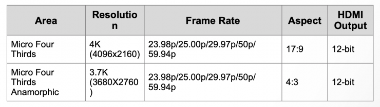 - 4K / Anamorphic (4:3) 3.7K, 12-bit RAW video output via HDMI.