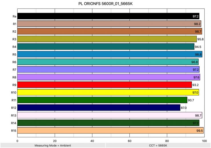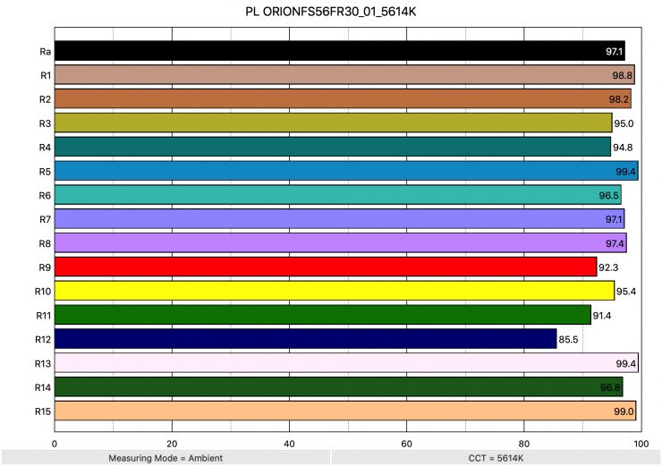 In the graph above the gold bars indicate a perfect CIE D55 source. The red bars indicate a perfect CIE D 5600K source. This lets us compare how close to a perfect 5600K lighting source the Orion 300 FS is. A score in the low 70’s is typical for a 5600K LED source.