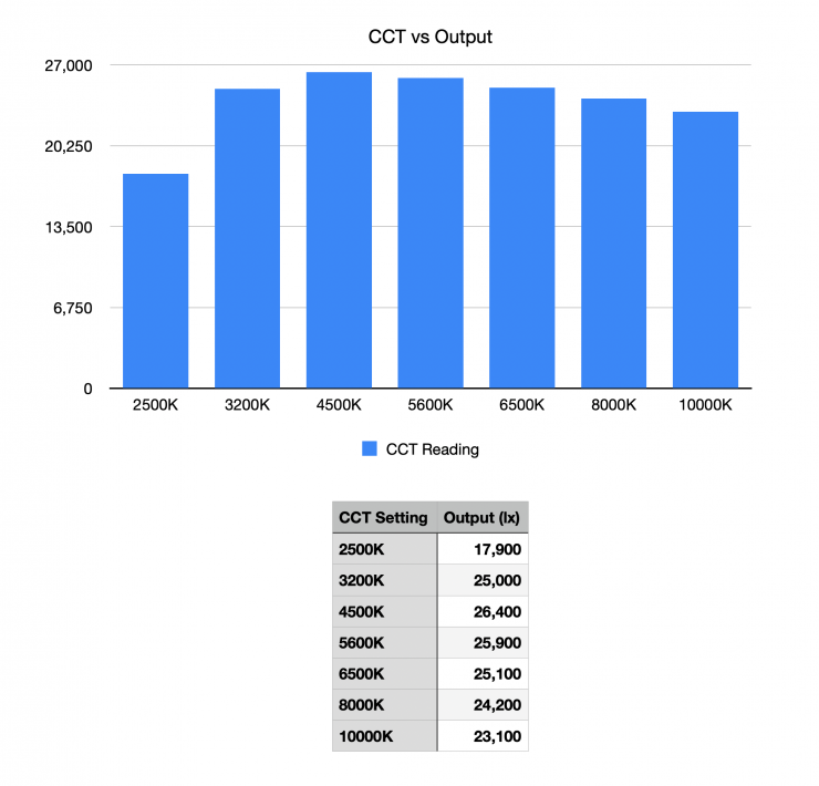 These figures might look confusing, but what it tells me is that the light is very Kelvin color accurate at all temperatures. Any MK-1 score that is under -9/9 means you wouldn’t have to use any color correction gels. The MK-1 scores for this light were extremely good, especially at 4500K and above.