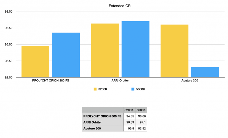 The main reason we want to record SSI scores is so we can see how well they match with other lights. As an example, I wanted to see how well the Orion 300 FS matched the ARRI Orbiter and Lupo Dayled 2000 Dual Color Pro. Below you can see the results.