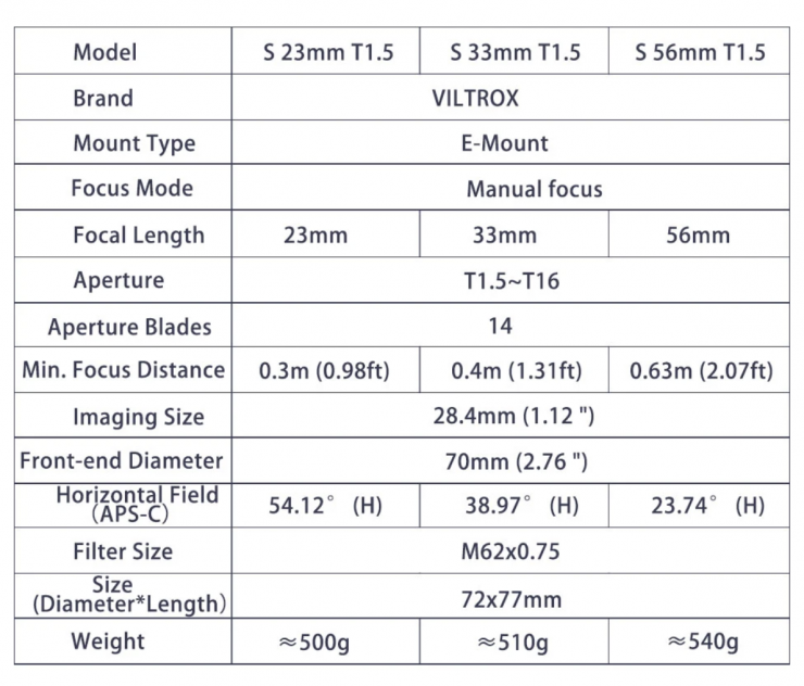 Viltrox already makes 23mm F1.4, 33mm F1.4, and 56mm F1.4 autofocus lenses for Sony E-mount APS-C cameras. These new versions are undoubtedly based on these lenses, but the optical construction of the cine versions does differ slightly.