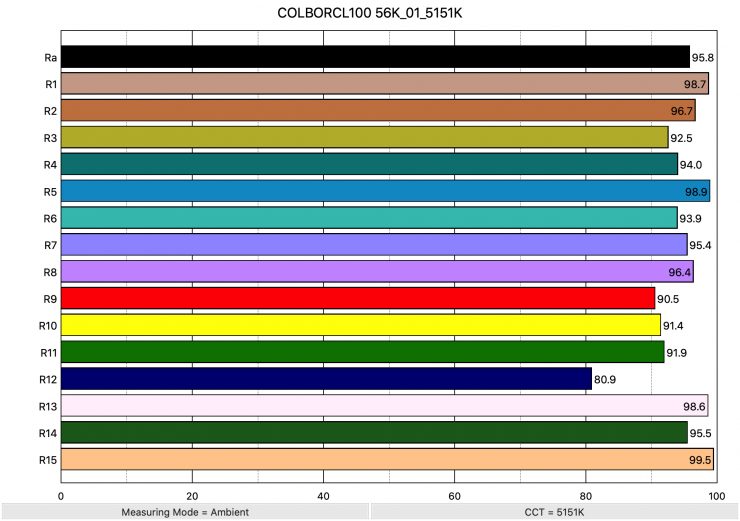 In the graph above the gold bars indicate a perfect CIE D55 source. The red bars indicate a perfect CIE D 5600K source. This lets us compare how close to a perfect 5600K lighting source the COLBOR CL100 Bi-Color is. A score in the low 70’s is typical for a 5600K LED source.
