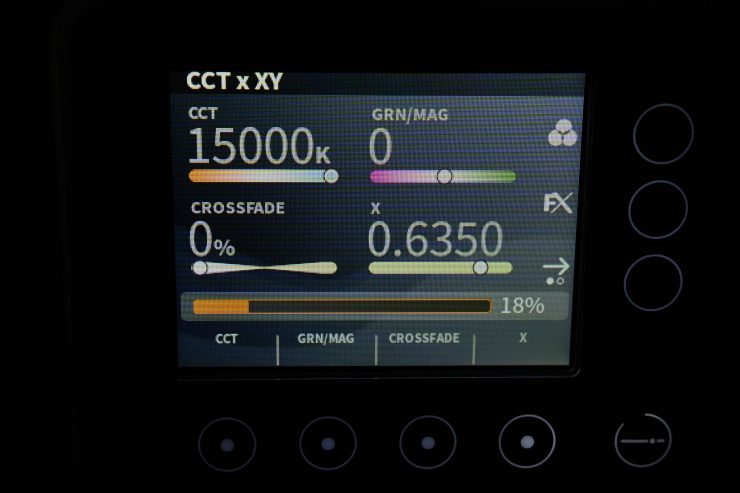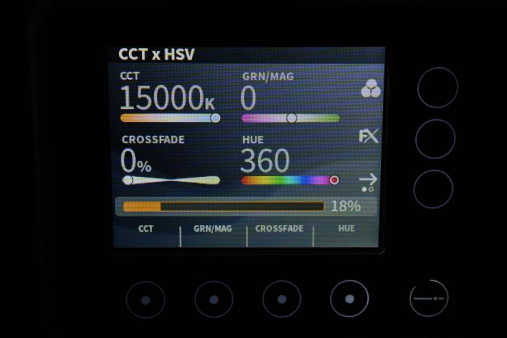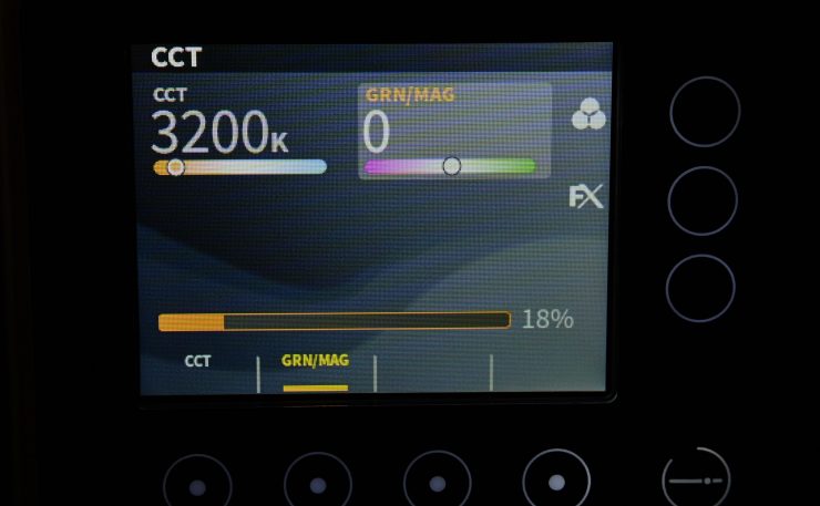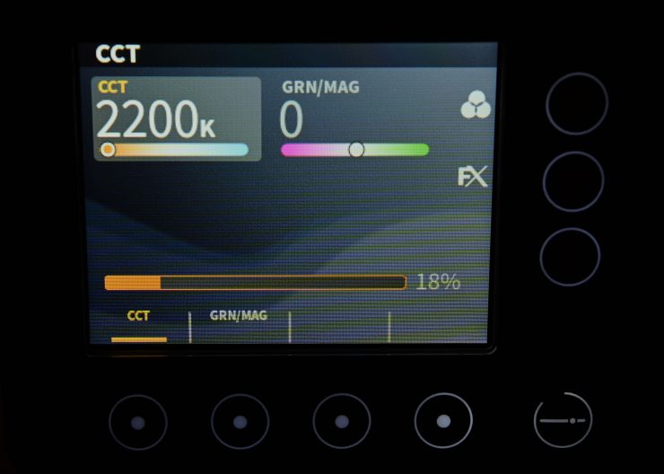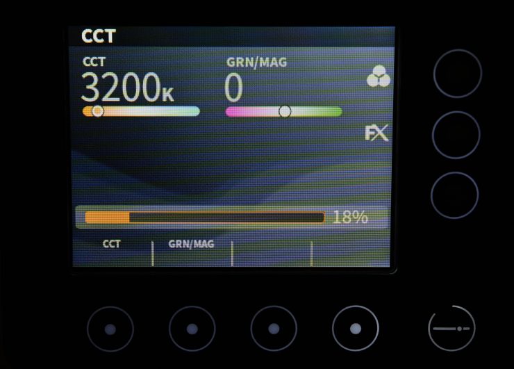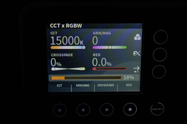 The fixture features calibrated red, green, blue, and white LEDs (RGBW) which allows it to produce white light in any CCT from 2200K to 15000K. It also has green/magenta adjustment and it is claimed to produce vivid, saturated colors.