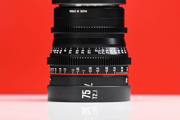 The minimum focusing distance of the 75mm T2.1 is 70cm / 2.29′ and it has a front filter diameter of 77mm. The lens has a focus throw of 270 Degrees and both the iris and focus ring feature industry-standard 0.8 pitch gears. It is possible to manually pull focus from infinity to the minimum focusing distance in one go, despite the large 270 degrees of rotation. This is mainly because the physical size of the lens barrel isn’t that big.