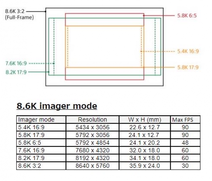 - 8.6K 8192 x 4320) 17:9 (full frame) 23.98p, 24p, 25p, 29.97p, 50p, 59.94p