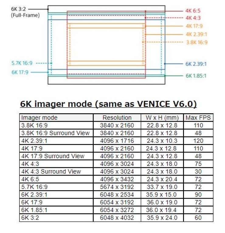 The 6K version of the VENICE 2 uses the same exact 36.2 x 24.1 mm (43.5 mm Diagonal) 24.8MP (total) sensor that is found in the original VENICE. All of the exact same resolutions and framerates that are available on the original VENICE will be available on the VENICE 2 6K.
