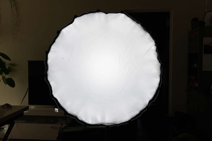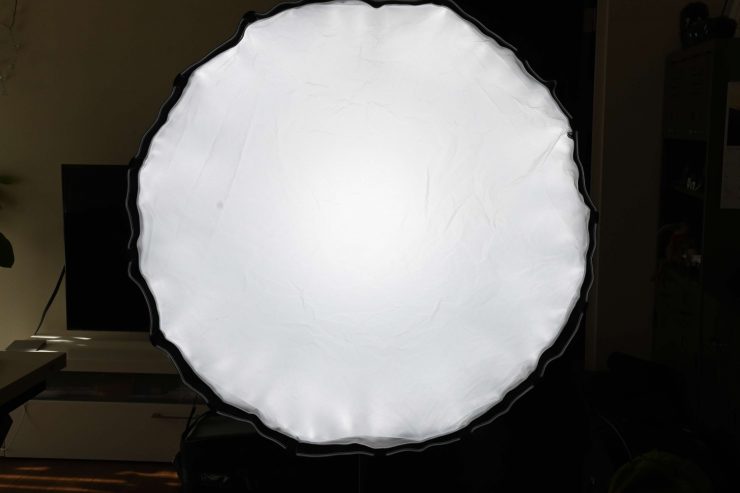I found that because of the 85-degree beam angle when using the fixture open face, the light doesn’t quite fill up a large softbox. While it still does a decent job, there is going to be a bit of fall off out towards the edges of a softbox.
